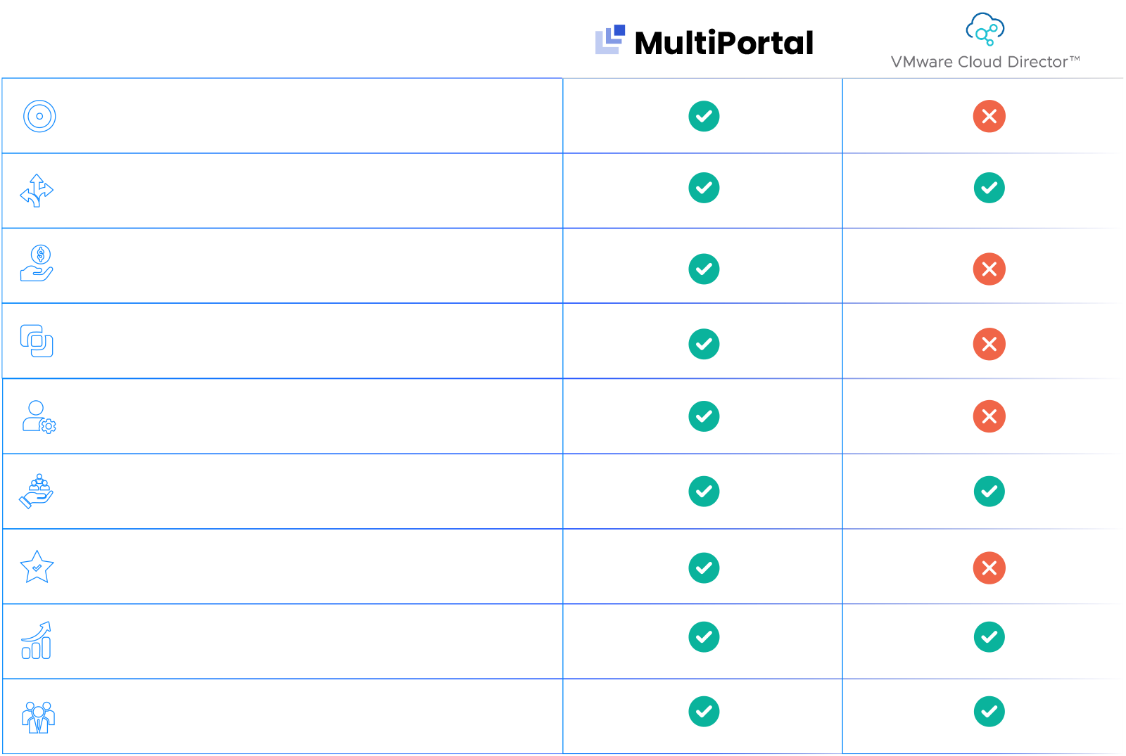 At MultiPortal, we change the game with a platform engineered for service providers and enterprises who need simplicity, agility, and efficiency in their infrastructure management. Why settle for a platform that dictates your process? VMware vCloud Director burdens businesses with rigid design and high costs, forcing them to navigate unnecessary complexity.